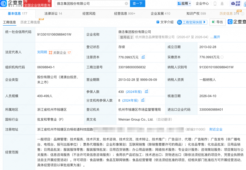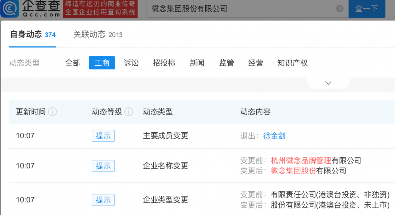 企查查APP最新显示,杭州微念品牌管理有限公司更名为微念集团股份有限公司,同时企业类型由有限责任公司(港澳台投资、非独资)变更为股份有限公司(港澳台投资、未上市)。信息显示,该公司成立于2013年2月,为李子柒前MCN公司,值得一提的是,该公司申请“李子柒”商标均已无效。