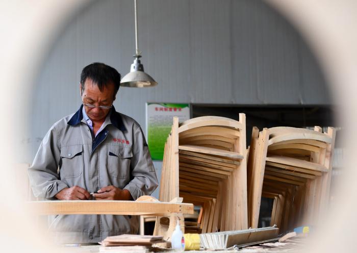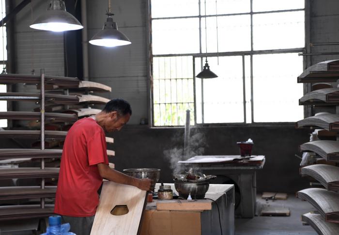 截至目前,全村共有82家家庭式作坊,从业人员900多人,带动建档立卡贫困户62户253人就业,年产民族乐器10万多台(把)。9月23日,工人在兰考县堌阳镇徐场村一家乐器生产企业制作乐器。
