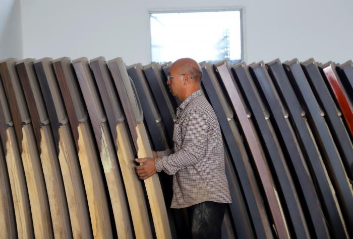 9月23日,工人在兰考县堌阳镇徐场村一家乐器生产企业整理乐器。