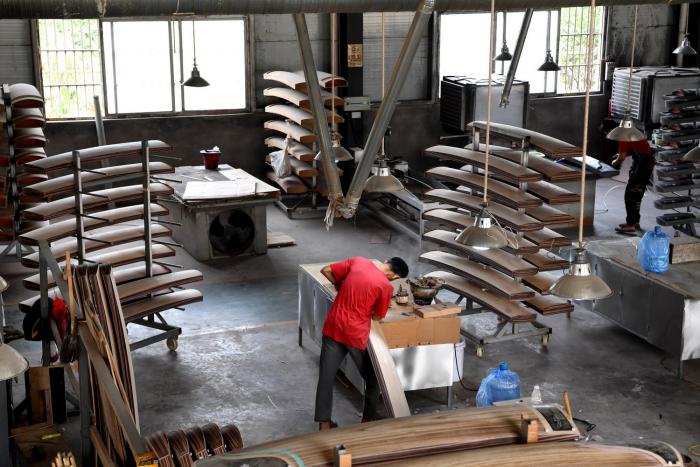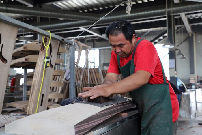 9月23日,工人在兰考县堌阳镇徐场村一家乐器生产企业制作乐器