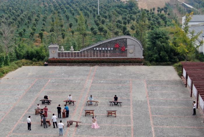 9月23日,村民和音乐爱好者在河南省兰考县堌阳镇徐场村广场准备演奏(无人机照片)。
