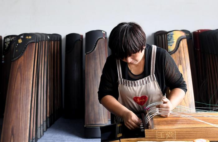9月23日,兰考县堌阳镇徐场村一位村民在家中弹奏古琴。近年来,河南省开封市兰考县堌阳镇徐场村利用当地的桐木资源优势,大力发展民族乐器产业,产品包含古筝、琵琶、古琴等多个品种,成为远近闻名的“乐器村”。