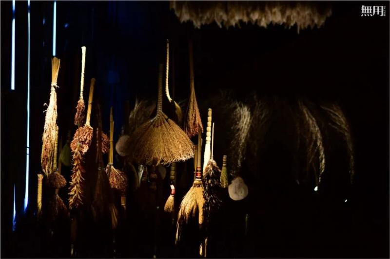 扫地的,扫天的,扫床的,扫粮食的,扫灰尘的,扫杂物的,应有尽有。它们在無用展厅中由各种扫具材料所构成的视觉艺术氛围里,呈现出各不相同的美好。正是由于不同的地域、气候、环境、植被及使用者的不同需求,才造就出了这么多形态各异、功能不一的扫具。而民间手艺人对美的追求,对生活和艺术的热爱,包括他们本民族本地区的文化,往往都会倾注到手作器具里面。即便在世人眼中卑微到尘埃里的扫帚,也有美的闪光点存在,也同样可以成爲艺术品。