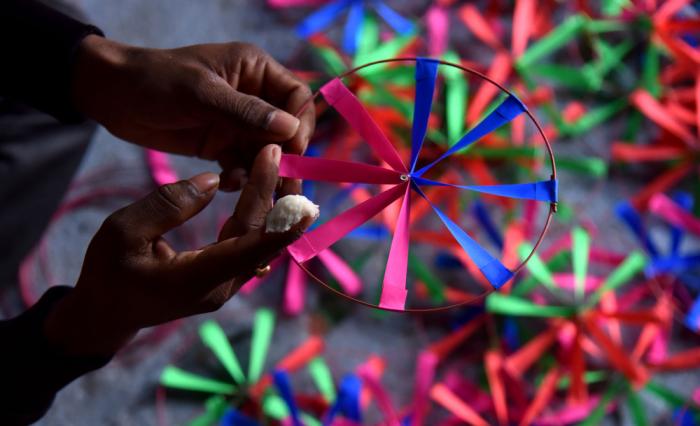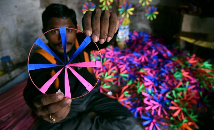12月7日,在印控克什米尔地区的查谟,一名手工艺人手工制作纸风车。