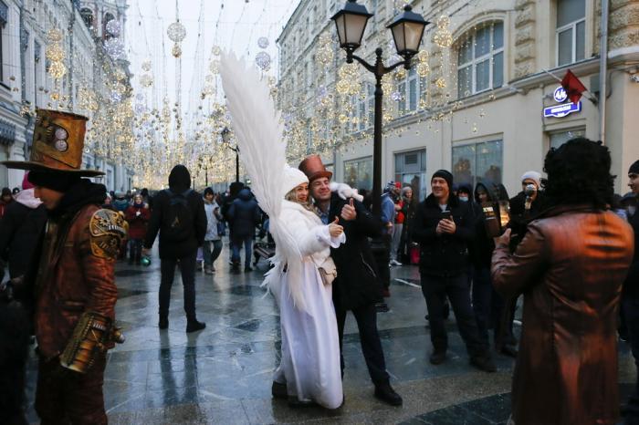2021年1月1日,在俄罗斯首都莫斯科,装扮成天使的演员与市民合影。