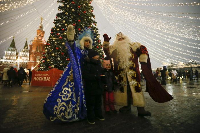 2021年1月1日,在俄罗斯首都莫斯科,装扮成严寒老人与雪姑娘的演员与市民合影。