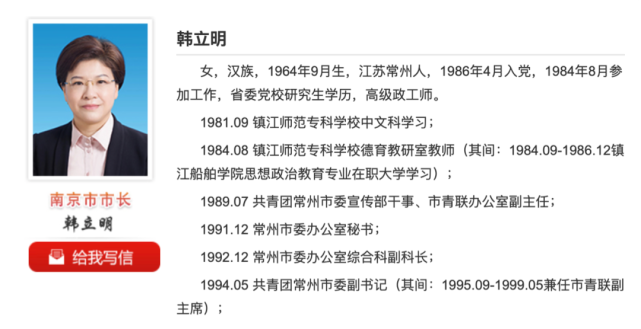 另外,就在今年4月,南京市市长韩立明(女)履新江苏省委常委、南京市委书记。