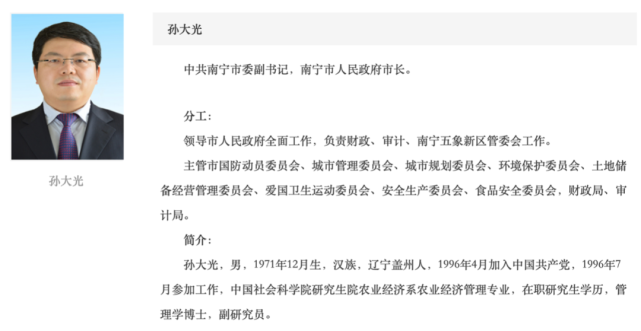 孙大光毕业于沈阳农业大学,毕业后曾在中国社会科学院农村发展所,后空降广西,历任农垦局副局长,梧州市委常委、副市长,崇左市市长,自治区党委宣传部常务副部长等,2021年3月任南宁市代市长,4月去代转正。
