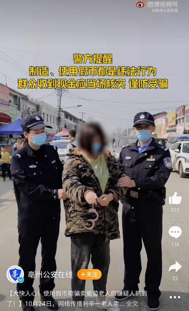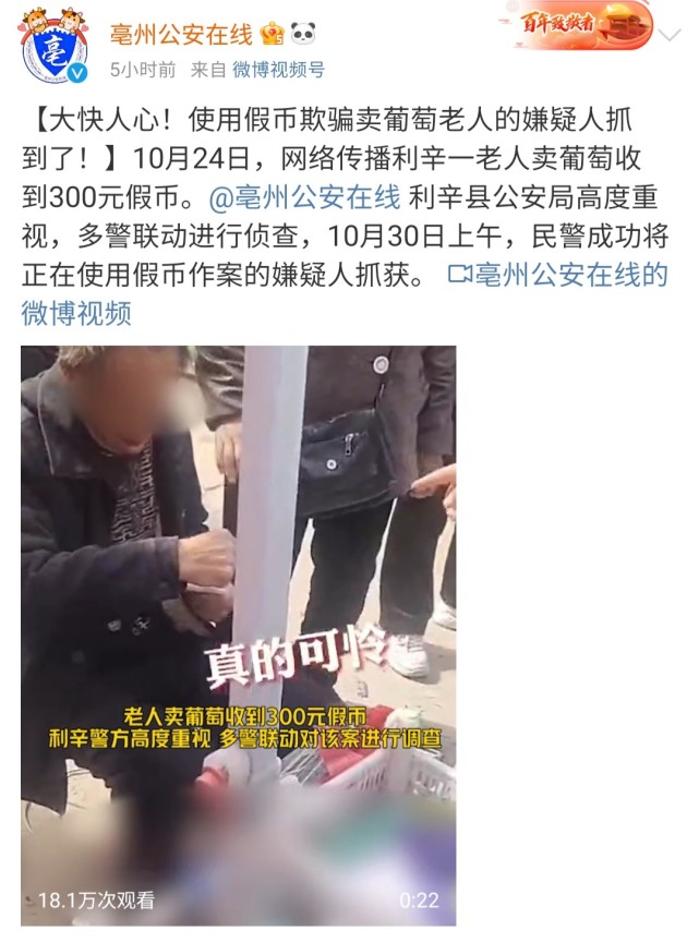 10月24日,有网友爆料,安徽亳州市利辛县一老人卖葡萄收到300元假币。10月30日,据安徽省亳州市公安局官微消息,利辛县公安局对此事高度重视,多警联动进行侦查,30日上午,民警已将正在使用假币作案的嫌疑人抓获。
