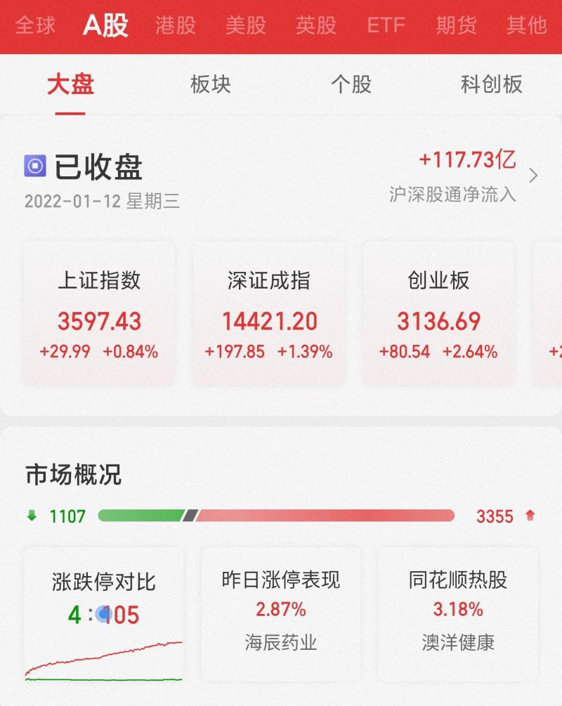12日(周三),A股三大股指集体高开。截至收盘,沪指涨0.84%,报3597.43点;深证成指涨1.39%,报14421.20点;创业板指涨2.64%,报3136.69点。沪深两市所有交易个股涨跌比为3355:1107,两市涨停105家,跌停4家。