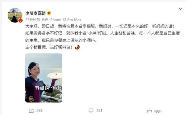 据悉,此前李嘉琦曾因“辣目洋子”这个艺名受到许多争议。辣目洋子宣布改名后,网友们也表示尊重她的选择,改回的本名也很接地气,还调侃“小辣”这个名字以后会不会变成“中辣”。