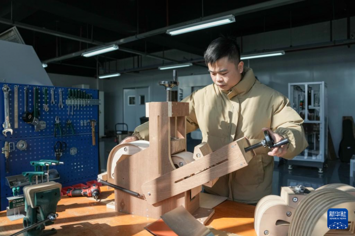 1月7日,研发人员在湖南宁乡的湖南省卡玛乐器制造有限公司研发试验室手工制作一把定制吉他。