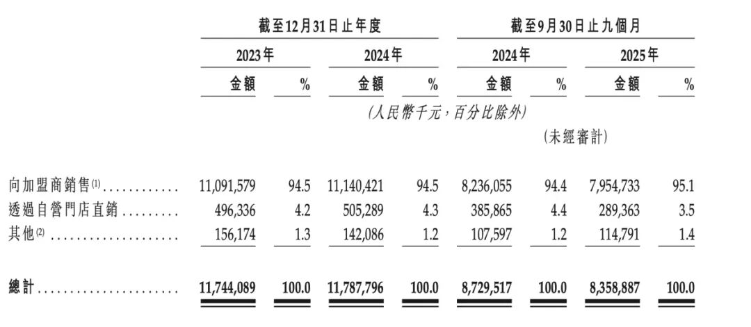 从财务数据来看,钱大妈本质也属于一家服务于加盟商的供应链公司。以2024年财报为例,公司总营收录得117.88亿元,其中向加盟商的销售金额高达111.4亿元(剔除加盟费及特许权使用费收入后,纯商品销售约为109.71亿元),占比呈压倒性优势。相比之下,直营门店的销售额仅为5.05亿元。这一营收结构与当年门店分布一致:在全2922家门店中,加盟店多达2863家,是绝对的市场主力。