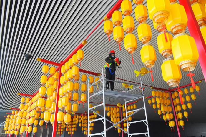 工人们正在搭建灯笼装置。