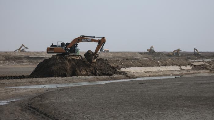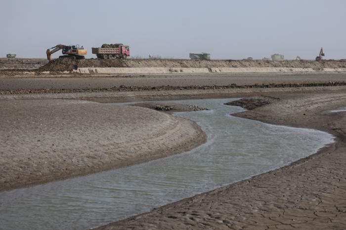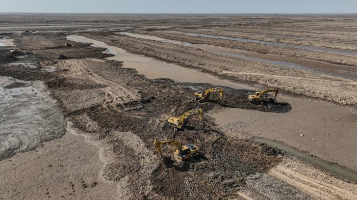 该生态修复项目总工期3年,将通过实施退养还湿、潮沟水系疏通、盐地碱蓬种植等八项修复措施,系统推进滨海湿地生态治理。项目计划完成生态修复总面积 3.5万亩,整治修复岸线7210米。修复工程完工后,将有效解决修复区域内滨海湿地整体性与完整性受损、生态系统功能退化、潮沟连通性不足等突出问题,进一步提升辽河口滨海湿地生态质量。4月1日,大型机械在湿地修复工作现场作业(无人机照片)。