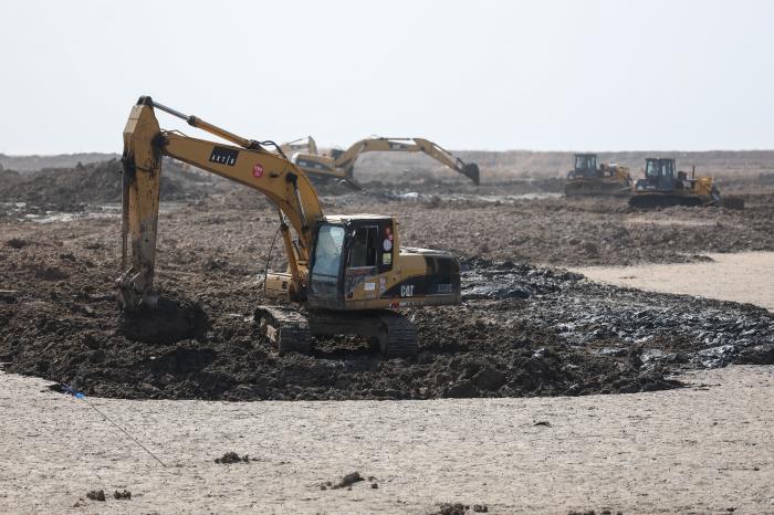 春日,在辽宁辽河口国家级自然保护区内,数台大型机械有序开展地形修复作业。这里是盘锦市海洋生态保护修复工程项目的施工现场。 新华社记者 潘昱龙 摄