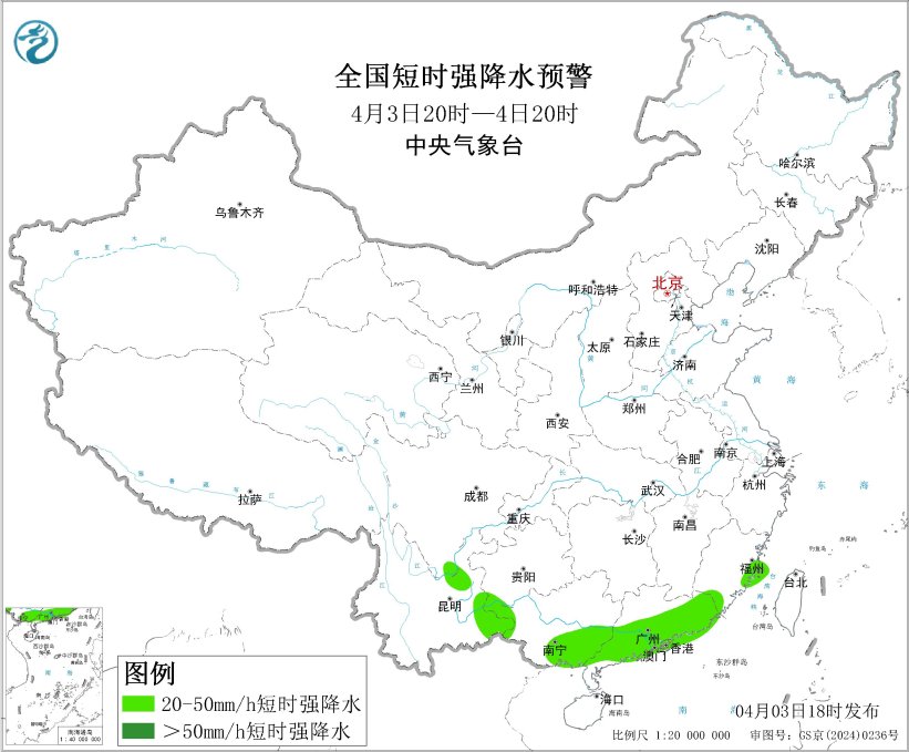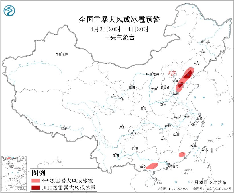 预计4月3日20时至4日20时,山东北部、广西东南部、广东东部等地的部分地区将有8级以上雷暴大风或冰雹天气,其中,山东北部的部分地区将有10级以上雷暴大风,最大风力可达11级以上;云南东部、广西南部、广东中南部、福建东部等地的部分地区将有小时雨量大于20毫米的短时强降水天气。