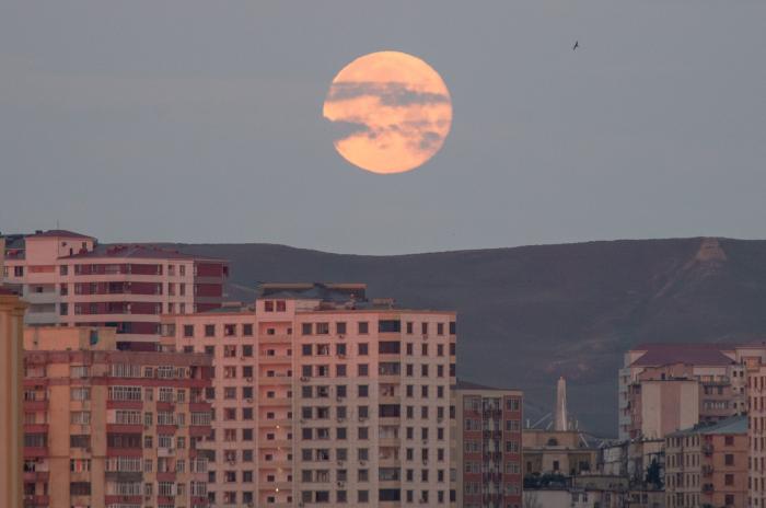 4月3日早晨,月亮从阿塞拜疆首都巴库的一处山顶落下。新华社记者 陈俊锋 摄