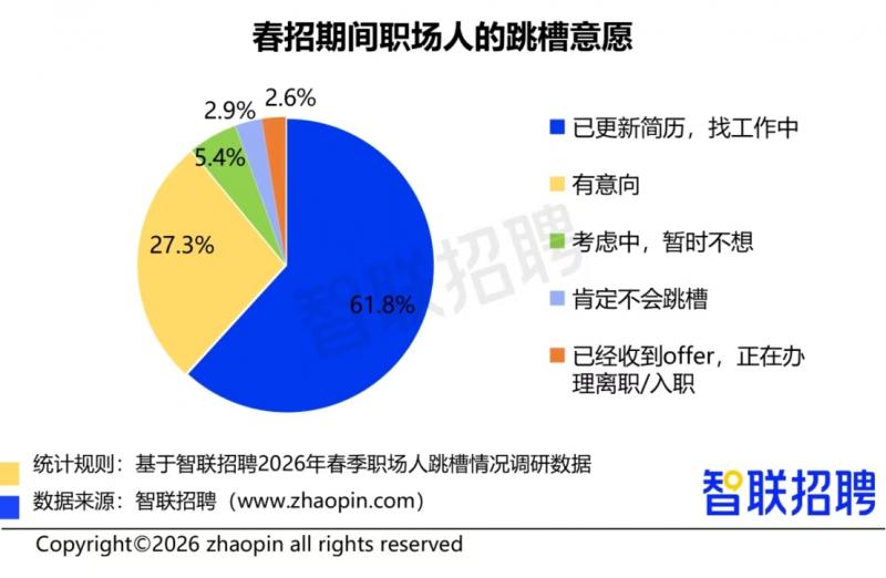 调研显示,过去近一年内67.5%的职场人跳槽0次,23.4%跳槽1次,跳槽2次及以上的仅9.1%,仅3成职场人跳槽。但在2026年春招期间,职场人的跳槽意愿强烈。有61.8%的职场人表示“已更新简历,找工作中”;27.3%的职场人“有意向”跳槽;2.6%已经收到offer;合计91.7%的职场人有跳槽行为/跳槽想法。说明大部分职场人想把握住“金三银四”好机会,找到更好的去处。