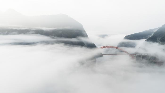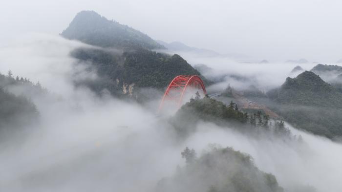 雨后初晴,地处鄂西山区的湖北省鹤峰县溇水河特大桥在云雾中若隐若现,如彩虹横跨天际,蔚为壮观。