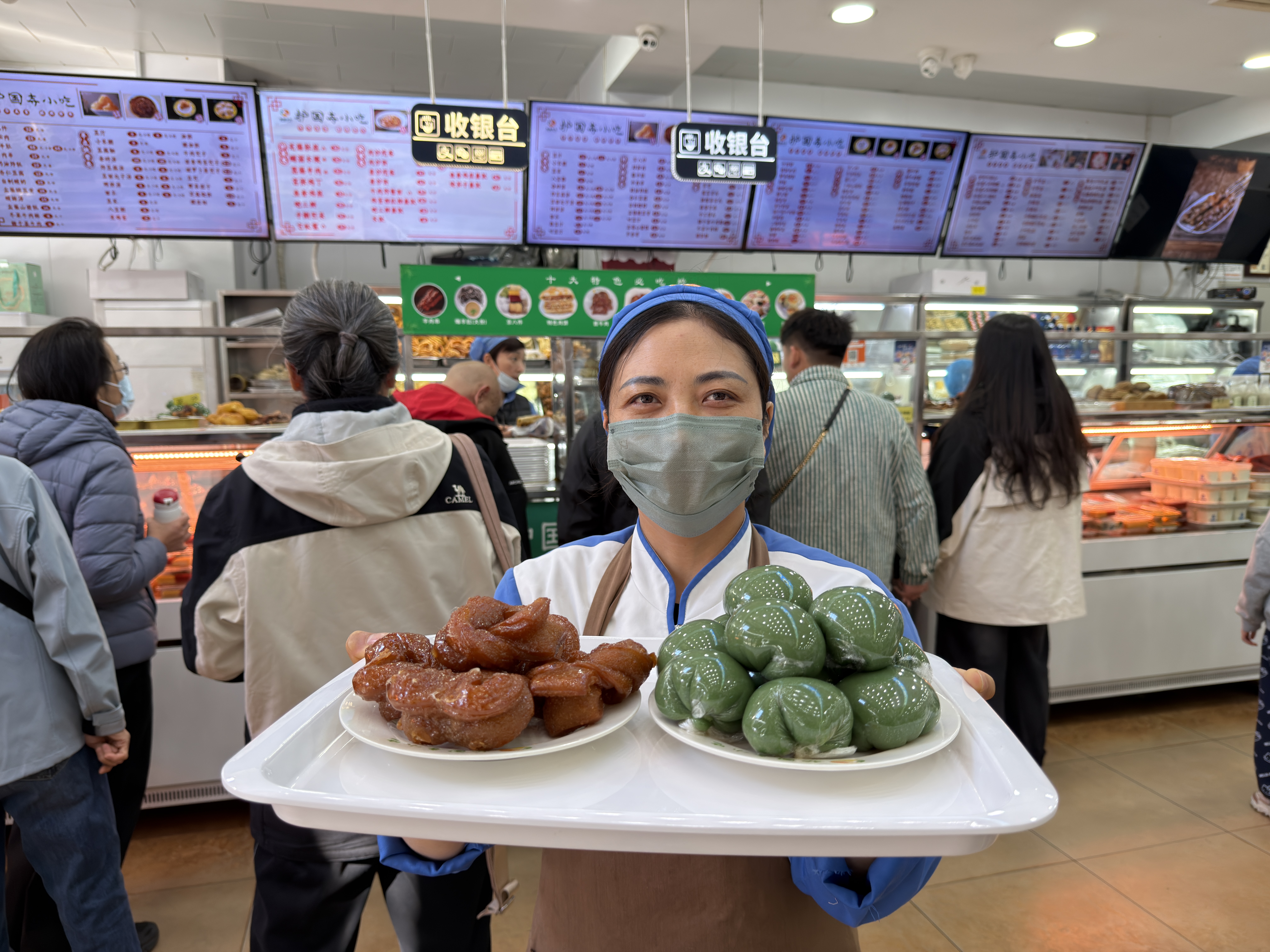 店员也向记者介绍,早在清明假期前一个星期,就已有不少顾客提前到店选购寒食小吃。假期期间,店里三种口味的青团每天销量可达一千枚左右,各类寒食整体销量是平时的两到三倍。