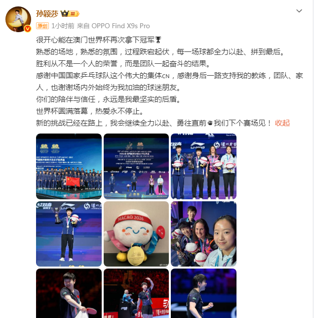 展望未来,孙颖莎写道:“世界杯圆满落幕,热爱永不停止。新的挑战已经在路上,我会继续全力以赴、勇往直前,我们下个赛场见!”