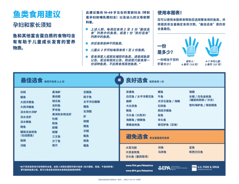 美国 FDA 根据重金属汞含量,对常见的鱼类进行了分类,帮助大家选择食用的鱼类,并确定食用次数。