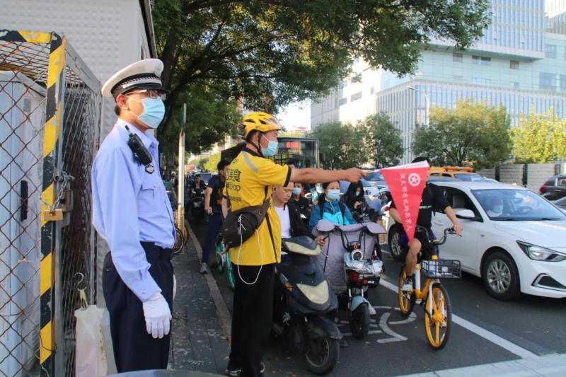 当天下午晚高峰时段,朝阳交通支队亚运村大队民警对一起未礼让行人车辆及多个未安全佩戴摩托车头盔、非法加装摩托车射灯等违法行为进行了处罚。在等灯间隙,民警走到斑马线前,对机动车驾驶人如何正确礼让斑马线进行宣传告知。与此同时,朝阳区公共文明引导员、属地交通志愿者及来自辖区单位的企业志愿者等,共同在惠新东桥四个路口进行交通疏导,倡议行人“红绿灯前讲秩序,斑马线前讲文明”。