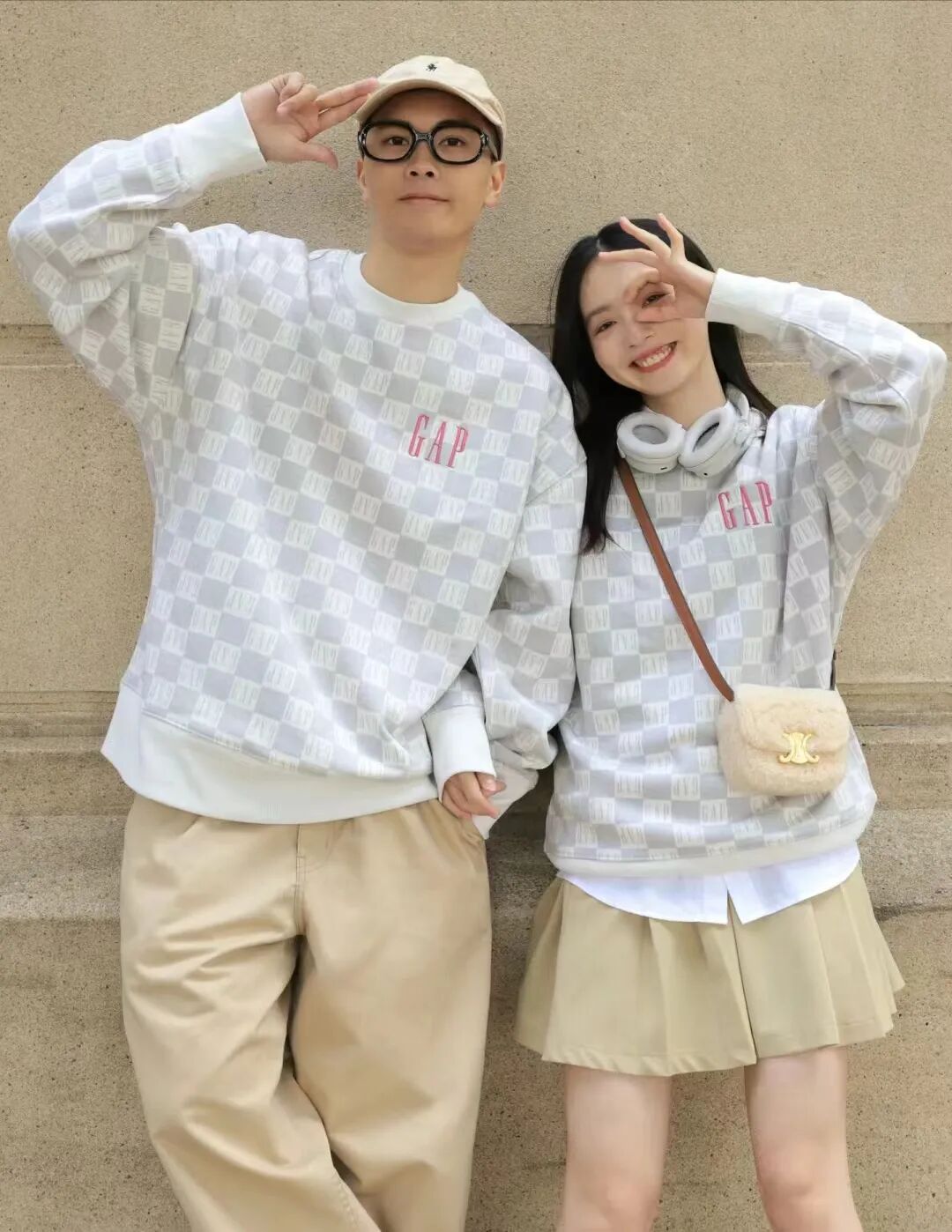 第二套情侣穿搭,乖巧斯文风卫衣,这一套浅灰色格子卫衣在气质上是非常经典的轻度美式氛围,不出格的乖巧斯文范,落肩款卫衣更显休闲。男生下穿卡其色阔腿裤搭配女生的卡其色百褶短裙,女生挎一个卡其色毛绒小包衬托冬季与春季交接的暖意。