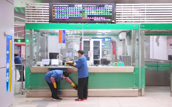 工作人员为新开的站点做保洁。