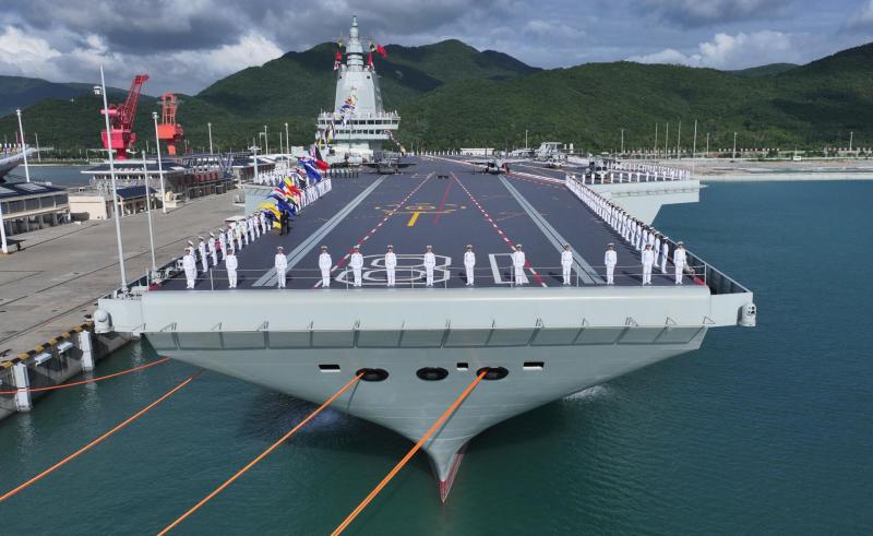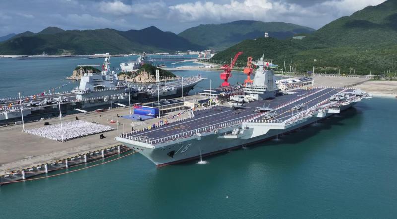 我国第一艘电磁弹射型航空母舰福建舰入列授旗仪式5日在海南三亚某军港举行