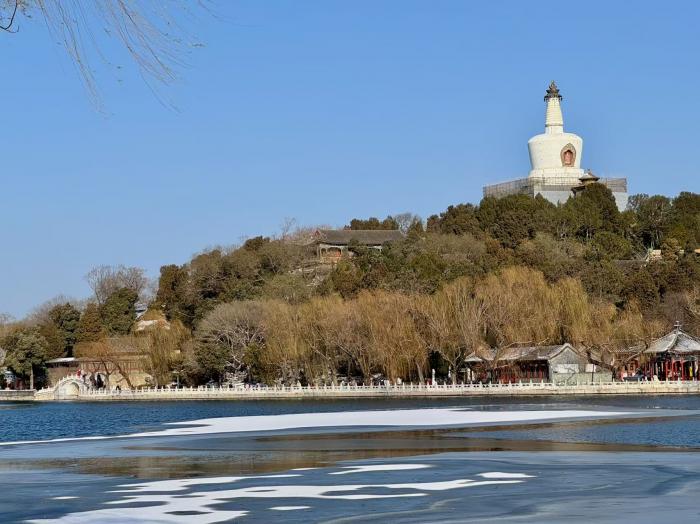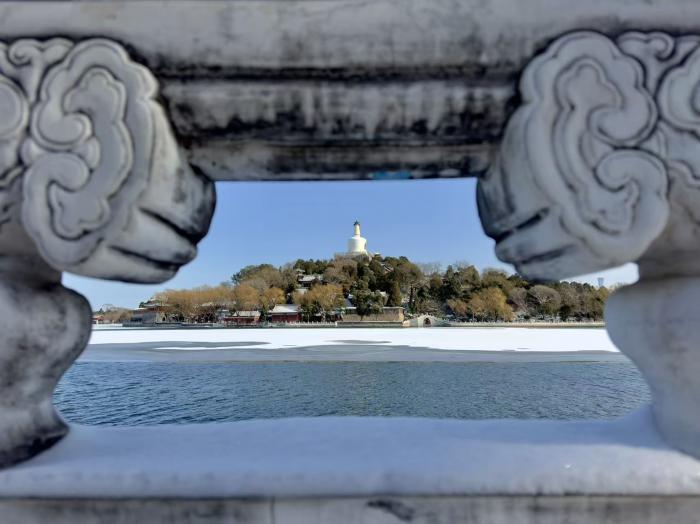 北海公园的白塔在白雪笼罩下圣洁静谧,琼华岛的枯枝缀雪宛如梨花绽放。