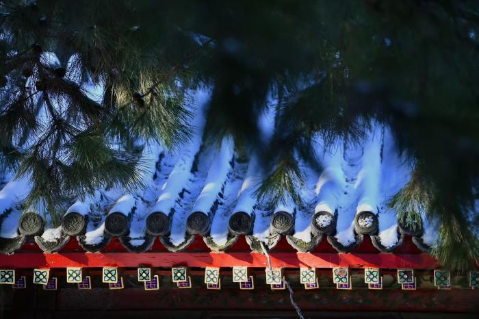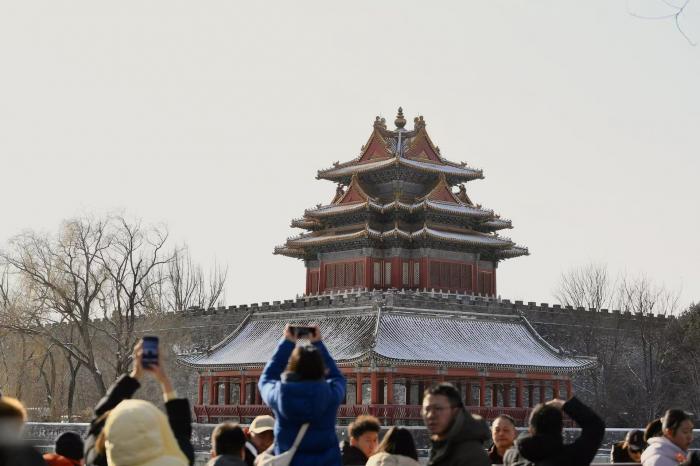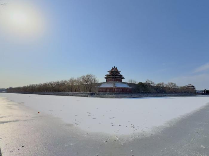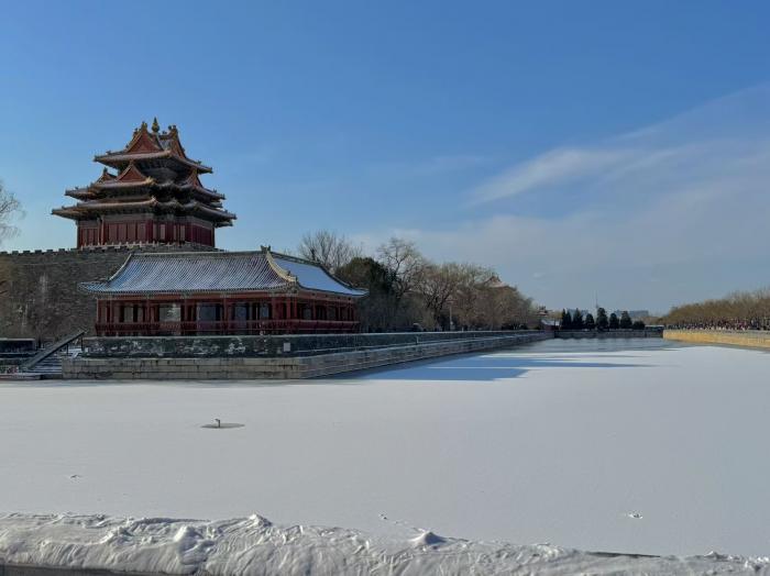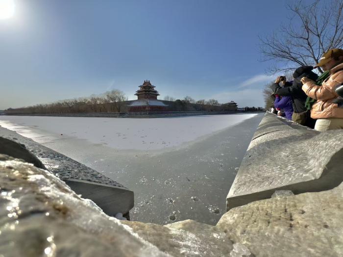 故宫角楼前,“红墙映雪”的经典场景如期上演,檐角冰棱与湖面倒影相映成趣,成为摄影爱好者的必拍点位