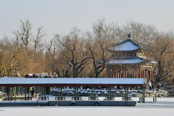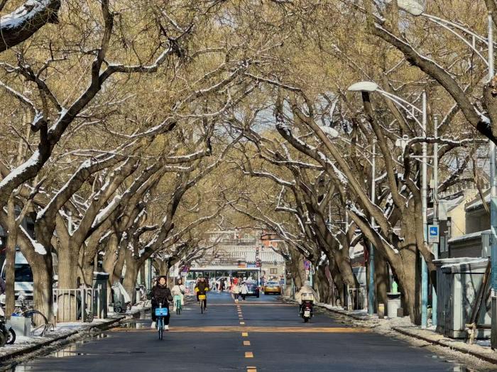 从皇城根下的古建群到街头巷尾的林荫道,从护城河沿岸到城市公园,整座京城仿佛被按下“美颜键”,白雪与红墙、灰瓦、绿树相映,勾勒出一幅全域皆景的冬日画卷,成为市民游客争相定格的绝美风景。这场初雪让古都的历史韵味愈发浓郁。