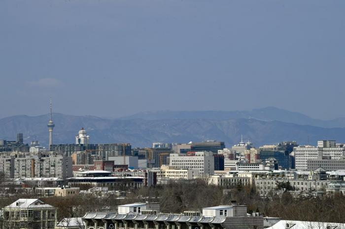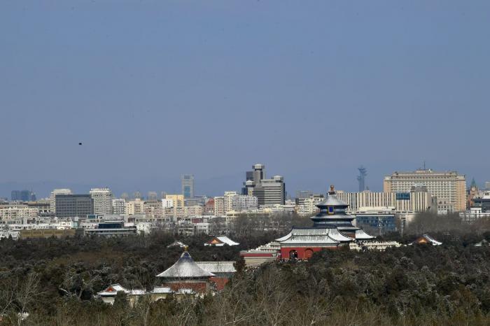 从南二环高楼鸟瞰天坛、电视塔与西山。