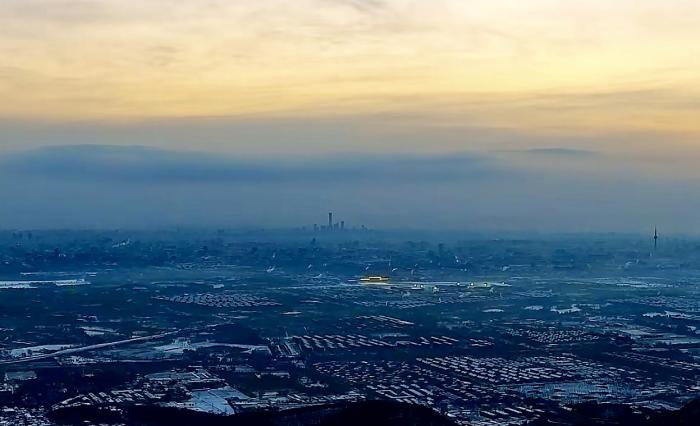 12月13日清晨,从香山附近鸟瞰整个京城银装素裹。