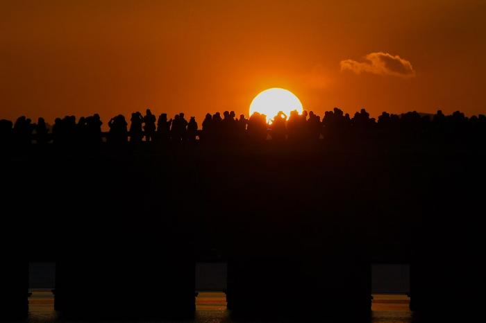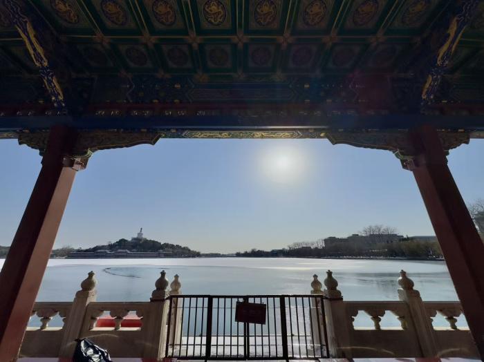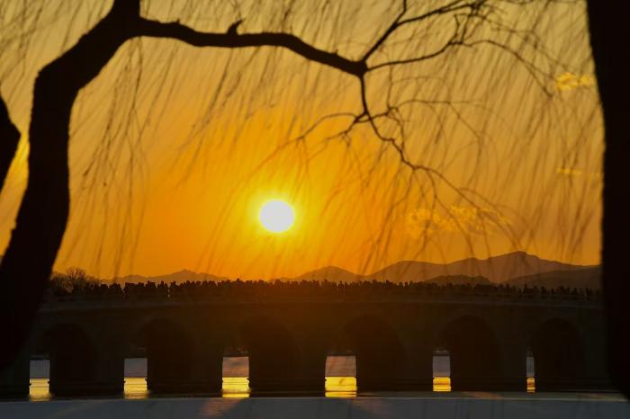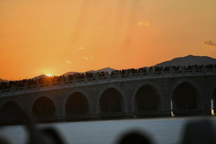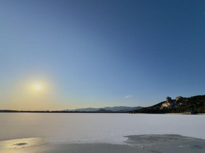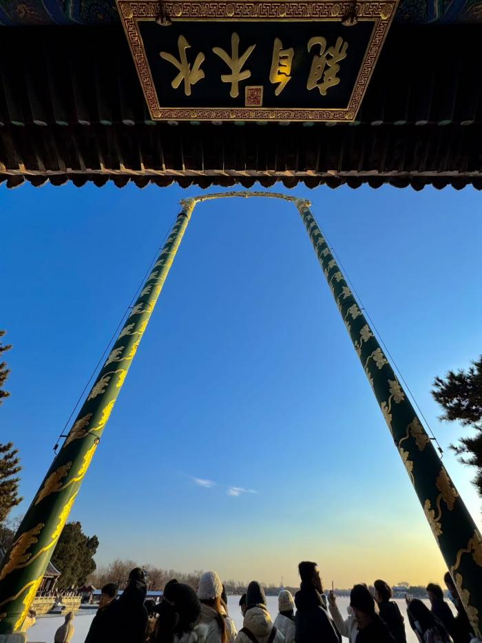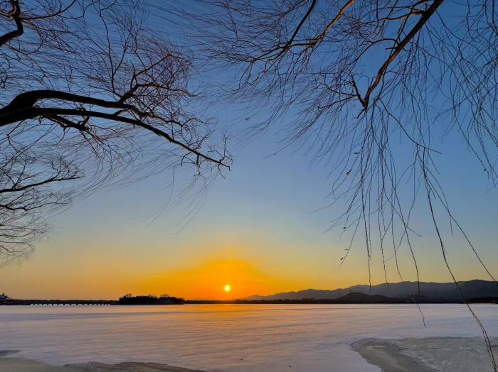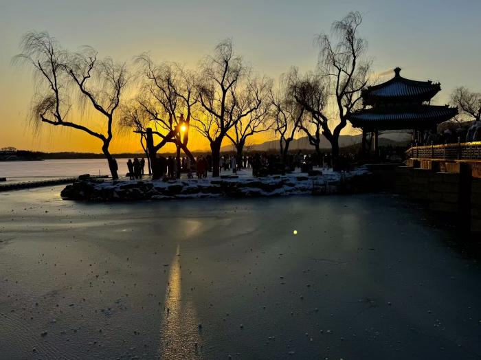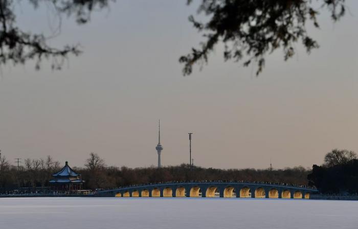 颐和园的十七孔桥在暮色中更具韵味,余晖为桥洞镀上金边,与桥上积雪交织成诗。
