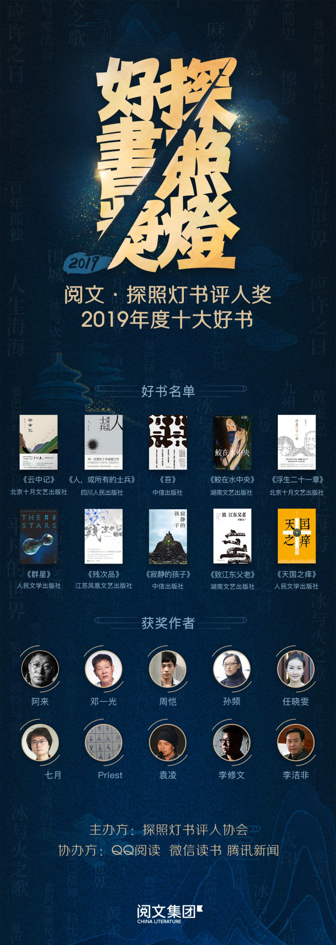 近日,阅文·探照灯书评人图书奖2019年度十大好书颁奖盛典在北京举行。阅文·探照灯书评人图书奖由资深媒体人张英发起,探照灯书评人协会主办,阅文集团大力支持,QQ阅读、微信读书、腾讯新闻协办,由作家邱华栋、阅文集团高级执行副总裁张蓉担任评委会主任,一批全国活跃的高校学者、作家、媒体人担任评委,是专业的华文“评论人和媒体书评人”奖。每月评出十本月度文学好书,年度评出十本年度文学好书,每年12月,在北京颁奖。