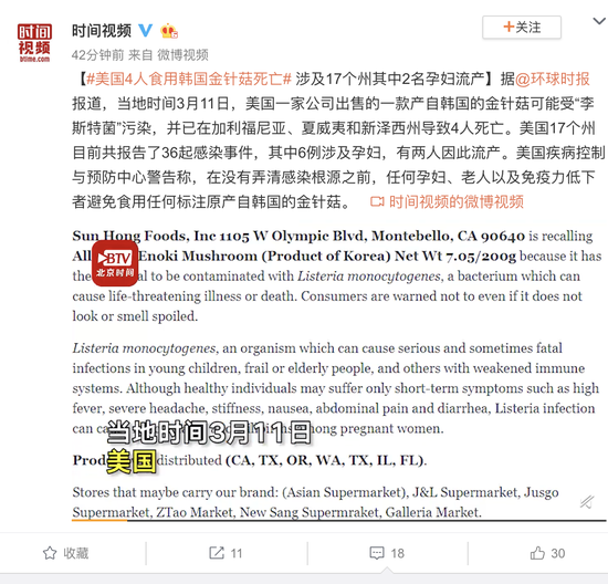 美国4人食用韩国金针菇死亡 涉及17个州其中2名孕妇流产