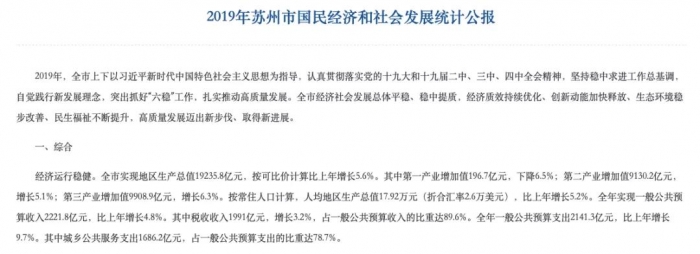 官方数据显示,2019年,苏州全市实现地区生产总值19235.8亿元,按可比价计算比上年增长5.6%。