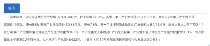 贵州官方数据显示,经初步核算,2019年全年全省地区生产总值16769.34亿元,比上年增长8.3%。