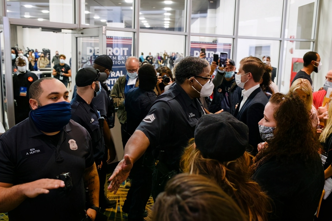 工作人员清点选票时,当地警察将人群阻挡在底特律选举部门外 图源:《纽约时报》