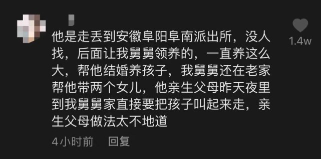 3月24日,一位自称是小郭养父母亲戚的网友称,小郭当年走丢到安徽阜阳阜南派出所,没人找,后来被其舅舅领养,一直养到这么大,还帮他结婚、养孩子。“我舅舅还在老家帮他带两个女儿,他亲生父母昨天夜里到我舅舅家,直接要把孩子叫起来走,亲生父母做法太不地道。”