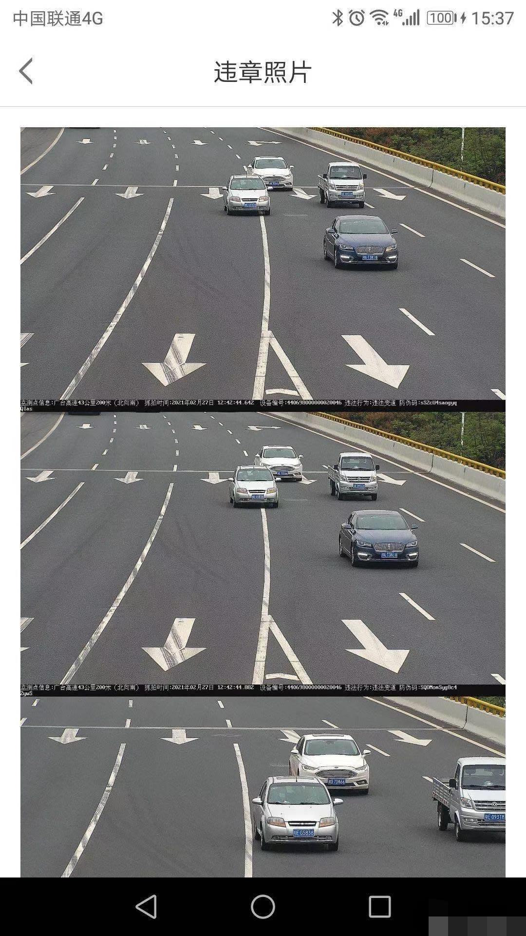 车主袁先生告诉北青-北京头条记者,他是2月27日在广台高速43公里200米处因压实线吃了罚单,这是他开车6年来的首张罚单。“当时我从佛山往江门方向开,到了北滘出口的岔道,原本4条车道变成6条,两个方向的岔道各3条车道,但北滘出口这个岔道只对应原本直行的一条车道,就是最左侧的车道。我那天是第一次经过这个地方,按导航开,导航提示可以走左侧第一、第二车道,在进入分岔口前,我也以为左侧这两条车道都能对应到左侧的岔道。结果不是,快到分岔口我发现左侧第二车道还要变到左侧第一车道才行,但当时我前面有一辆车挡住了岔道口的实线,前面那辆车刚刚好避开实线,但我要变道来不及了,也不能踩刹车,就被迫压实线了。”
