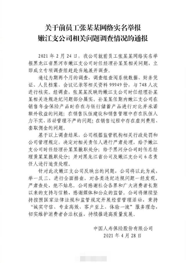 通报称,2021年2月24日,该公司就前员工张某某网络实名举报黑龙江省黑河市嫩江支公司时任经理孙某某相关问题,立即成立专项调查组赶赴当地展开调查。