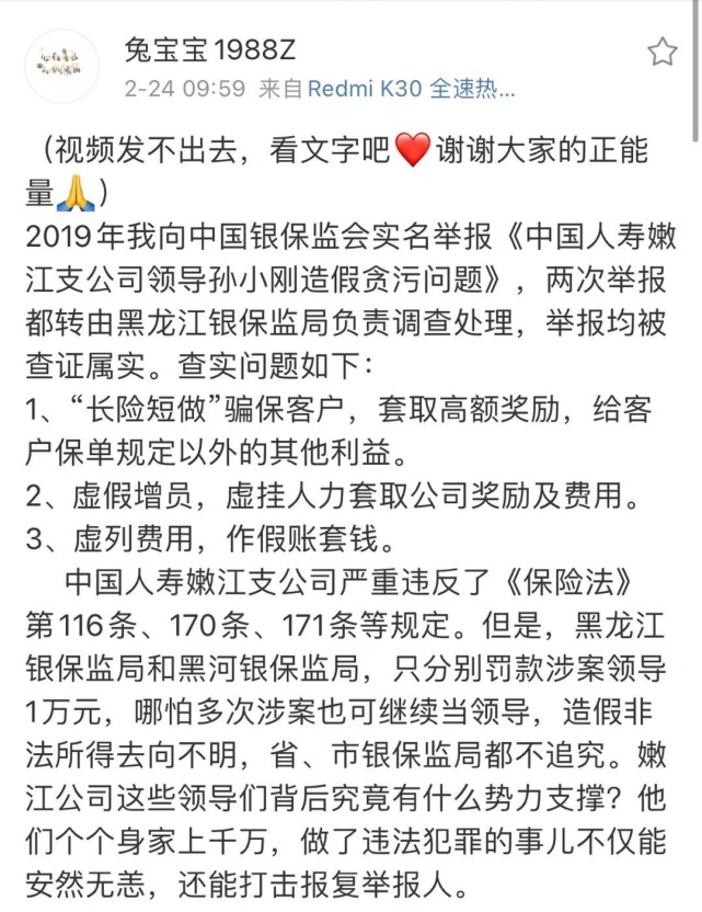 此前,中国人寿黑龙江分公司前员工张某某实名举报该公司保费造假套钱、用客户资料虚假增员、虚列费用等违法违规行为引发关注。4月28日,中国人寿通报调查结果称,举报部分属实,决定对相关责任人进行严肃处理,给予嫩江支公司时任经理孙某某撤职处分,给予黑河分公司时任总经理黄某某撤职处分,并对黑龙江省公司及嫩江支公司6名责任人进行追责处理。