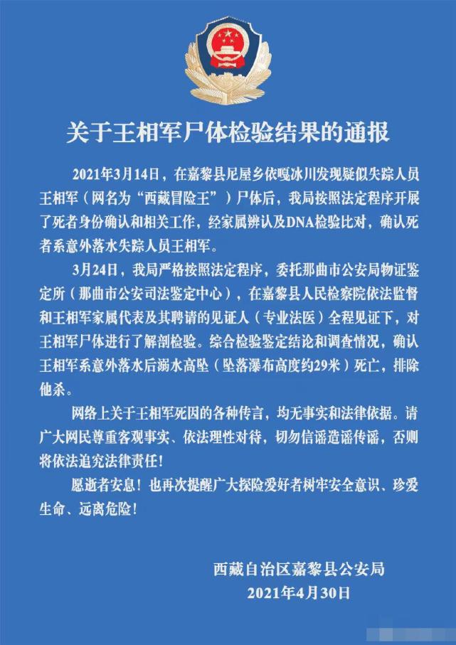 3月24日,该局严格按照法定程序,委托那曲市公安局物证鉴定所(那曲市公安司法鉴定中心),在嘉黎县人民检察院依法监督和王相军家属代表及其聘请的见证人(专业法医)全程见证下,对王相军尸体进行了解剖检验。综合检验鉴定结论和调查情况,确认王相军系意外落水后溺水高坠(坠落瀑布高度约29米)死亡,排除他杀。