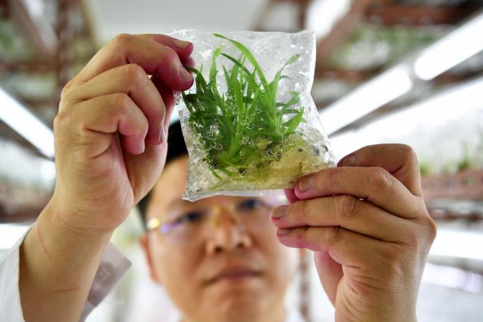 5月21日,科研人员在国家(海南)热带植物隔离检疫中心组培中心检查文心兰植株生长情况。