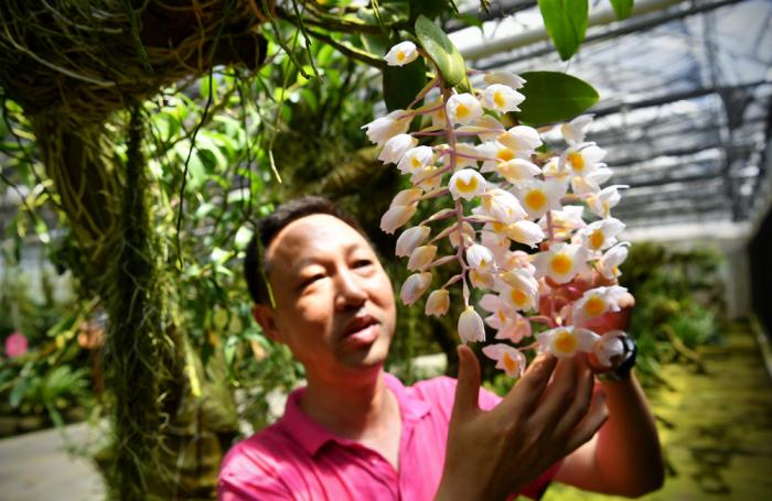 5月21日,在国家(海南)热带植物隔离检疫中心兰科物种检测鉴定资源圃,科研人员检查灯笼吊兰生长情况。