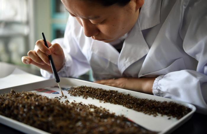 5月21日,科研人员在国家(海南)热带植物隔离检疫中心实验室进行有害生物检疫鉴定。 在隔检中心里,有来自世界各地千奇百怪的植物,科研人员在这里对它们进行鉴定和隔离检疫,防止可能携带危险的有害生物,并对优质种质资源进行收藏、扩繁。